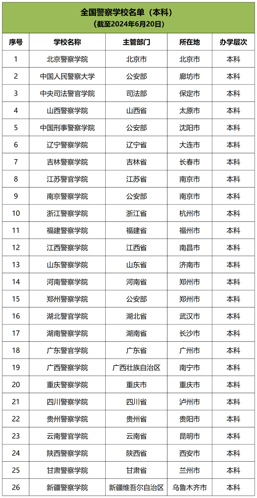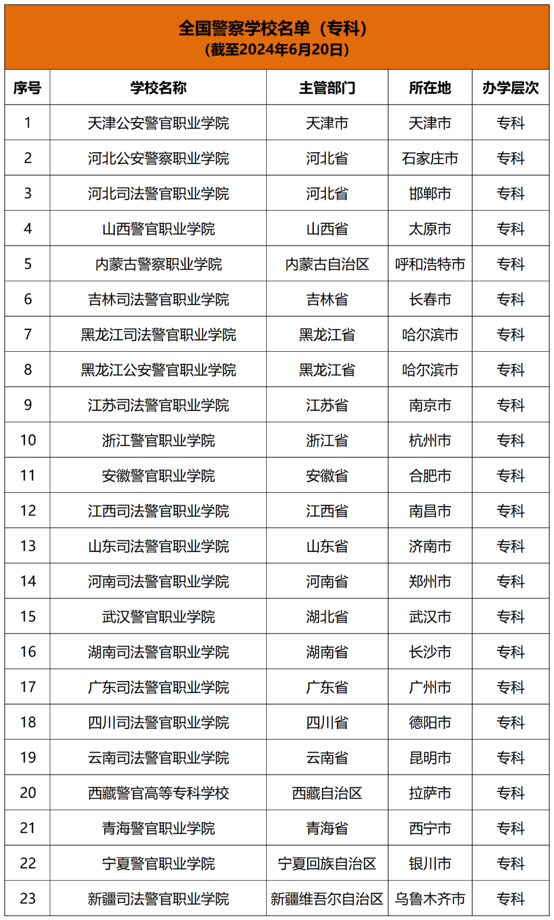 根据教育部最新公布的全国高等学校名单显示,截至2024年6月20日,全国共有49所警察院校,其中本科层次26所,专科层次23所。