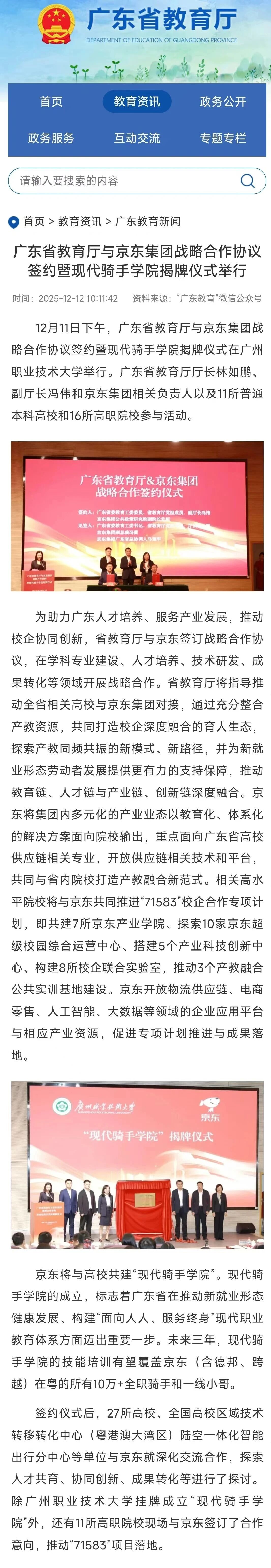 广东省教育厅与京东集团共建的 “现代骑手学院” ,是继新疆克拉玛依开放大学骑手学院的第二家骑手学院,只是各自聚焦的教学功能不同。