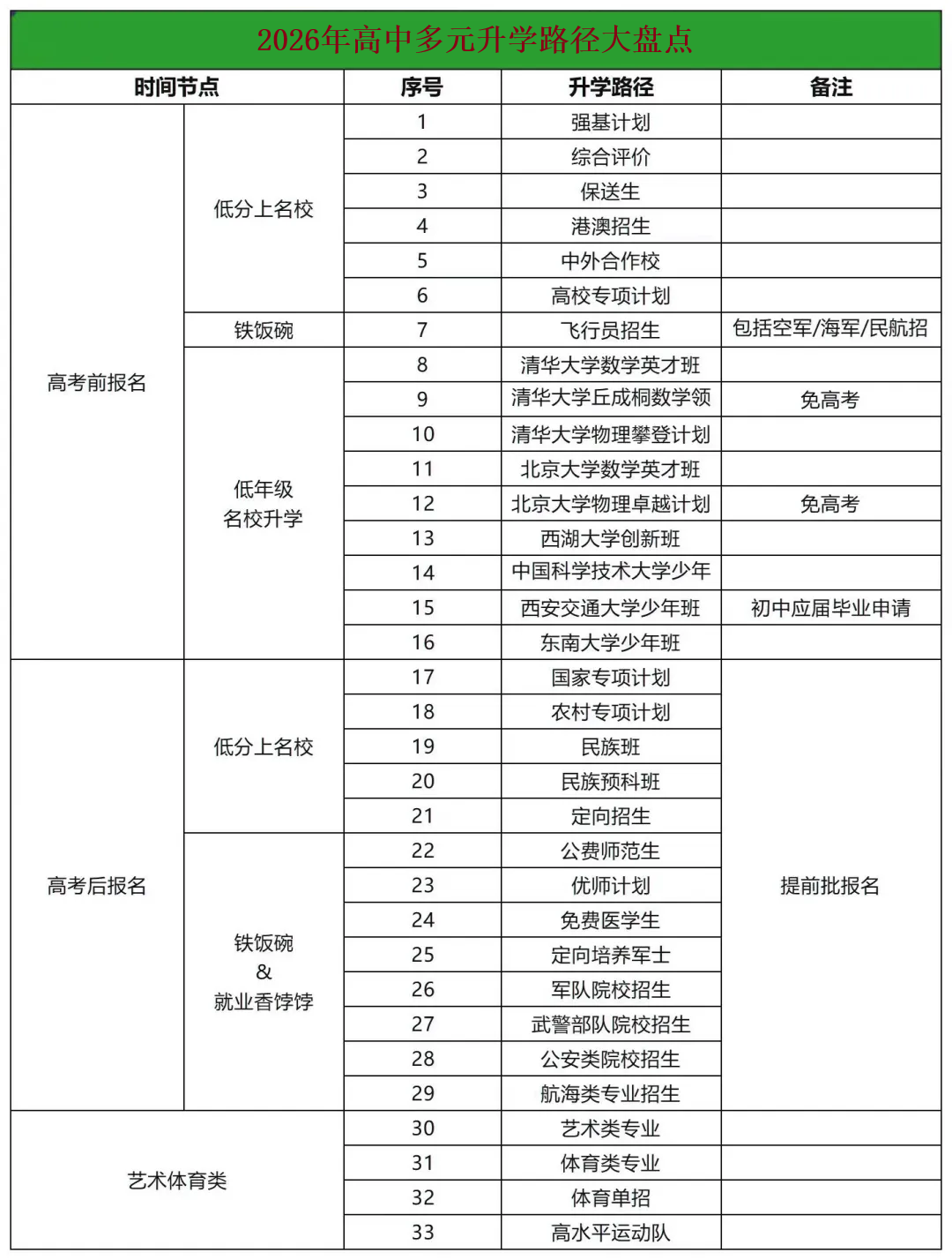 为了各位考生和家长能提前规划升学路线,今天给大家整理了除了高考外的二十种升学途径,高中各个年级都可以先收藏好,提前做好准备!