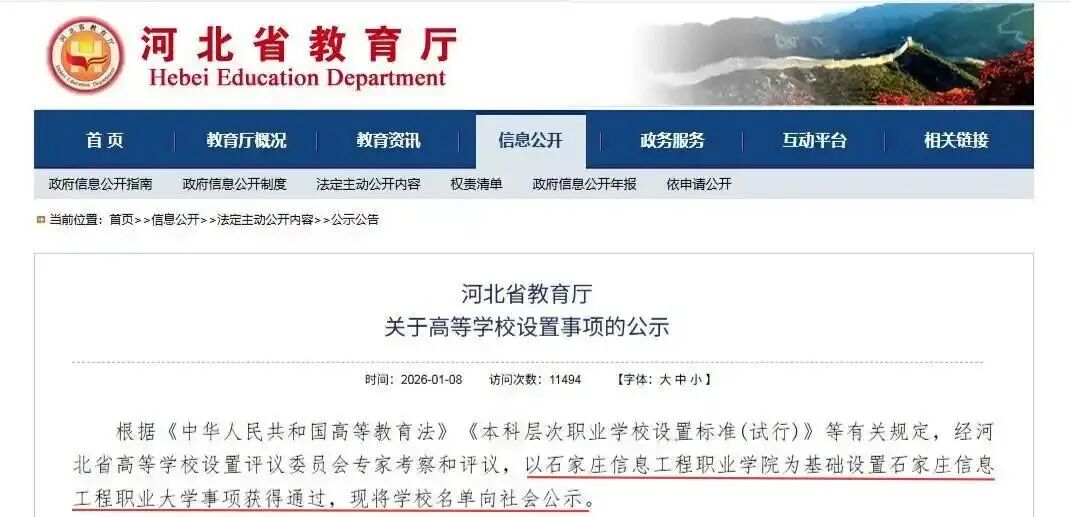 河北省教育厅于2026年1月8日公示,计划以石家庄信息工程职业学院为基础,升格设立石家庄信息工程职业大学。该事项已通过省级评议,待教育部审批。