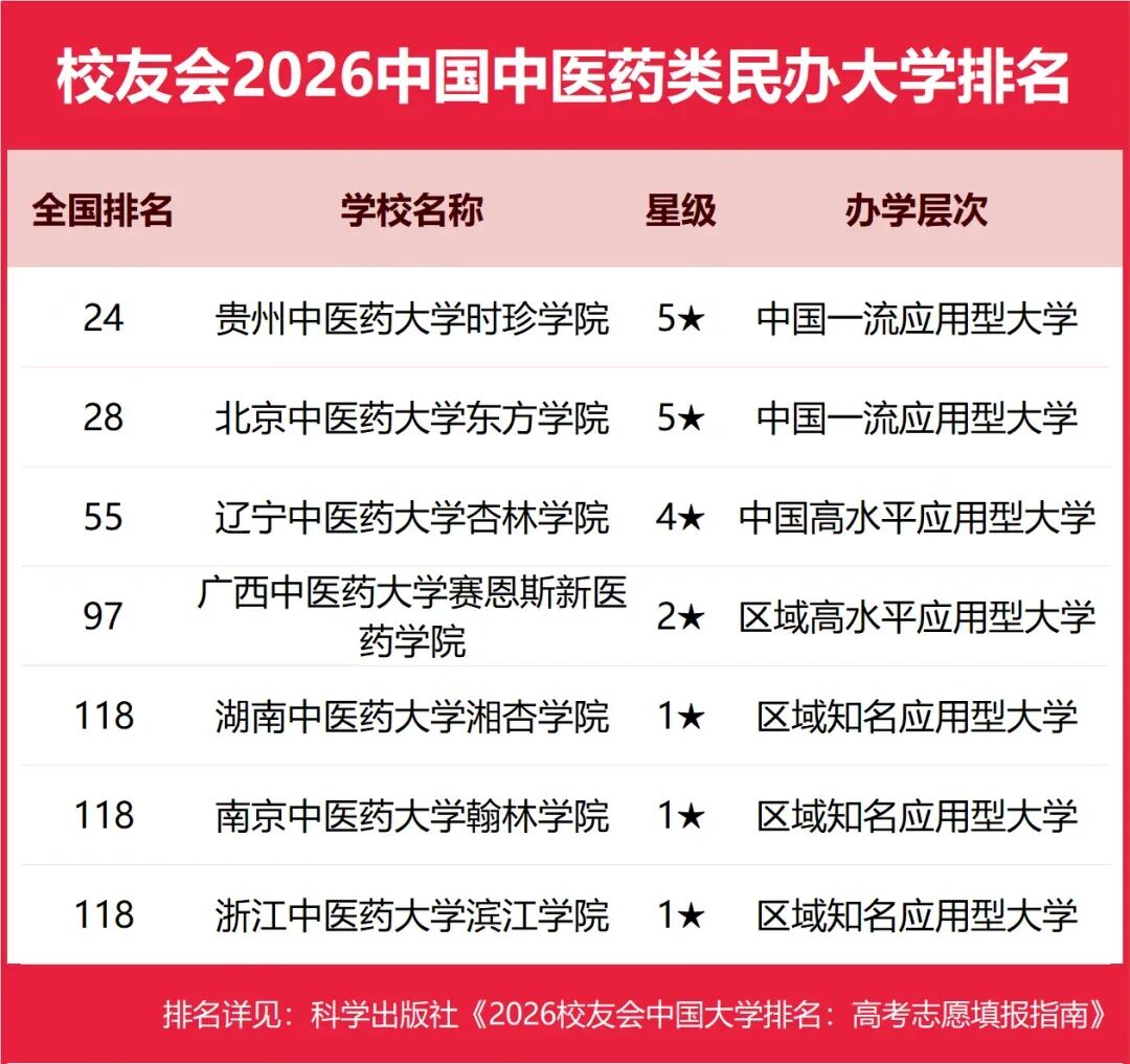 榜单后段则包括湖南中医药大学湘杏学院、南京中医药大学翰林学院等一批一星级院校,这些学校被认定为“区域知名应用型大学”。