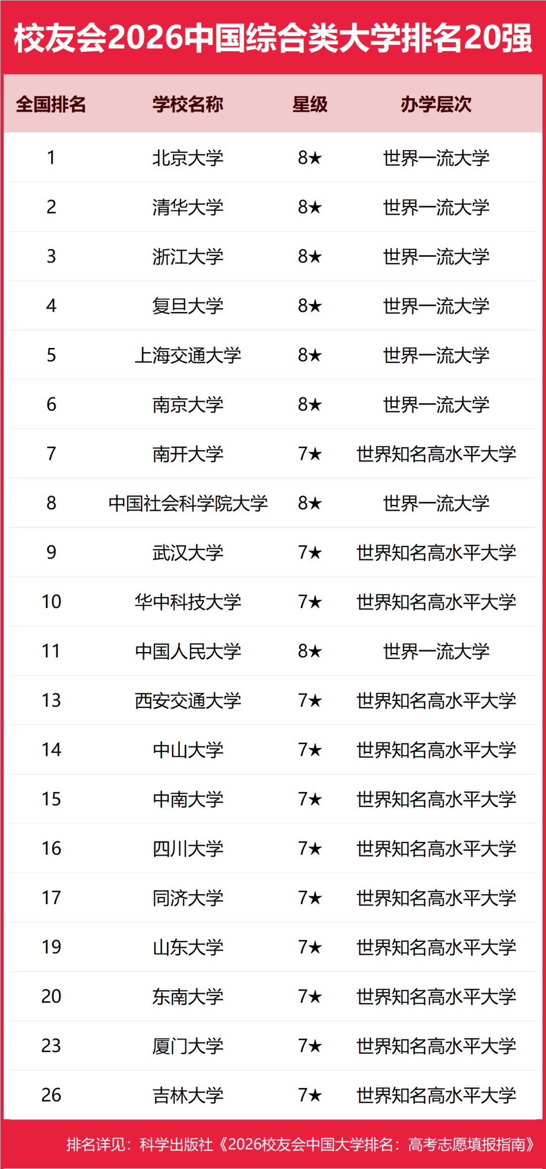 近日,校友会发布了 2026 年中国综合类大学排名 20 强榜单,北京大学、清华大学、浙江大学、复旦大学、上海交通大学稳居前五,成为无数考生和家长心中的 “白月光”。对于 2026 届高考生来说,这份排名不仅是实力的印证,更是志愿填报的重要参考。