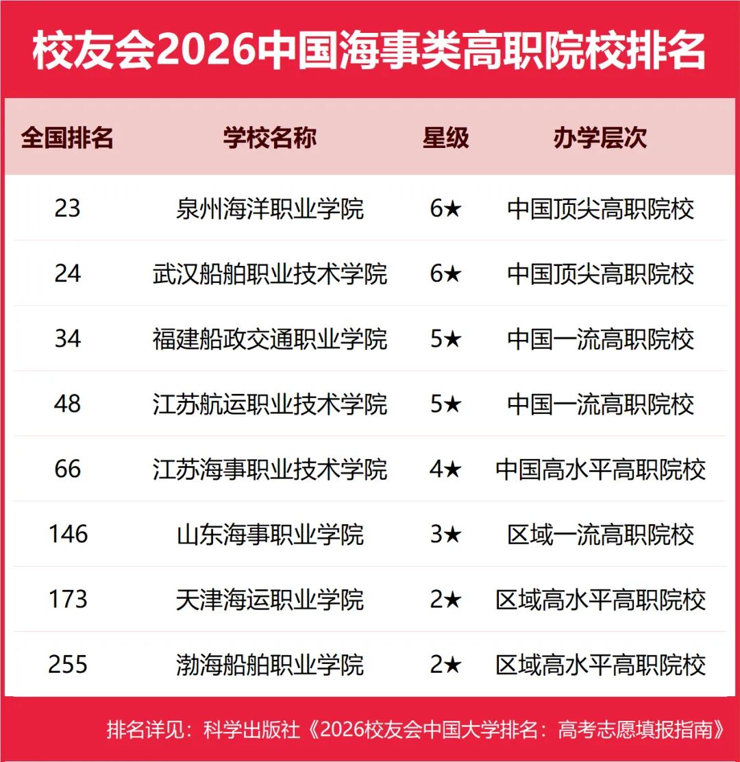 从校友会 2026 年的排名来看,海事类高职院校呈现出梯队分明的格局: