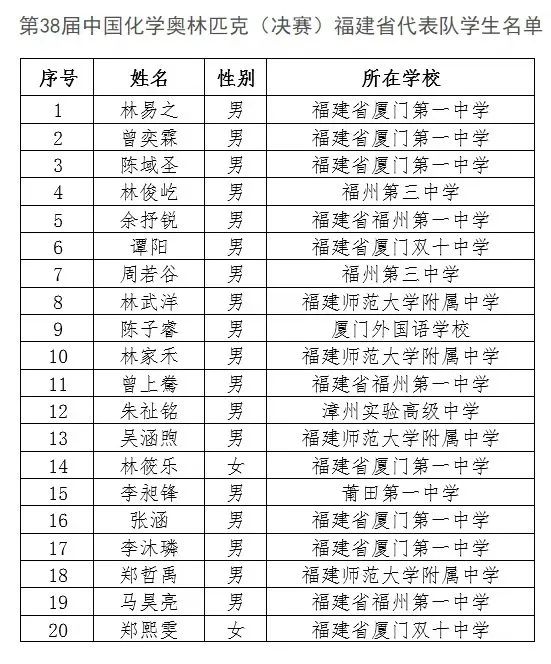 第38届中国化学奥林匹克(决赛)福建省代表队学生名单