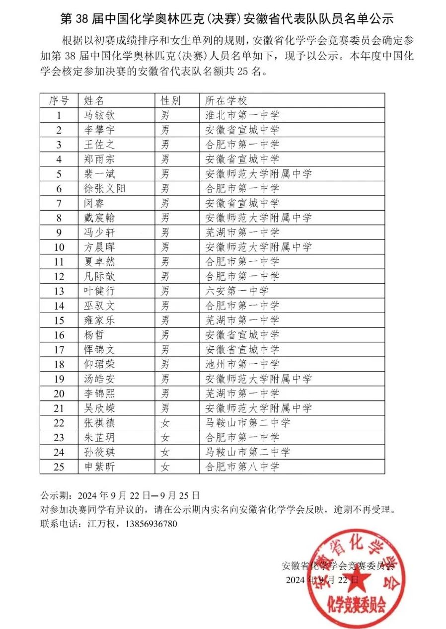 上海市化学化工学会根据中国化学会核定的“上海市第38届中国化学奥林匹克决赛代表队选手名额24名,增加女生省队名额2名,一共26名”。并按“第38届中国化学奥林匹克(决赛)上海市代表队队员选拔方式及相关规定”,依照本届初赛成绩从高到低排序等规则,拟定第38届中国化学奥林匹克决赛上海市代表队选手名单,现予以公示,公示网址:www.sscci.org。若对名单有异议,请电话或书面向上海市化学化工学会提出。异议应签署真实姓名并注明联系方式,否则不予受理。