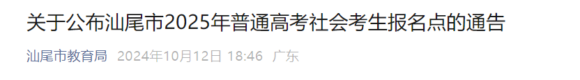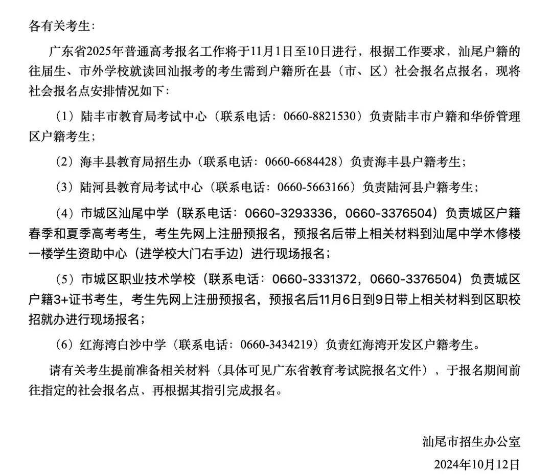 潮南户籍社会考生报名参加2025年普通高考有关事项通知如下: