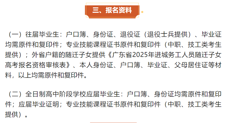 文件依据:《关于做好广东省2025年普通高校招生统一考试报名工作的通知》(粤招〔2024〕6号)(链接网址: