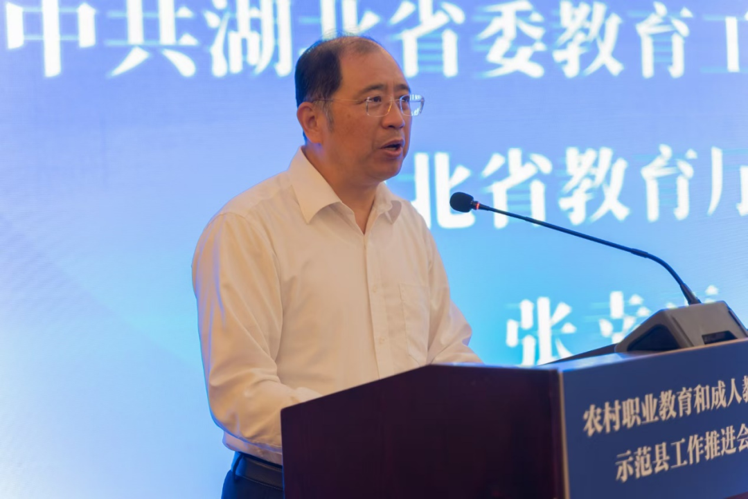 中共湖北省委教育工委专职副书记、湖北省厅党组成员张幸平首先致辞,他指出长期以来,湖北省委、省政府大力实施教育强省战略,大力促进农村职业教育和成人教育内涵式高质量发展,为乡村振兴和可持续发展提供强有力的人才支撑。省教育厅认真贯彻落实《教育部等九部门关于加快发展面向农村的职业教育的意见》精神和教育部关于开展国家农村职业教育和成人教育示范县创建工作的通知要求,主动担当作为,创造性开展工作,把示范县创建工作作为发展农村职成教育的重要抓手予以积极推进。