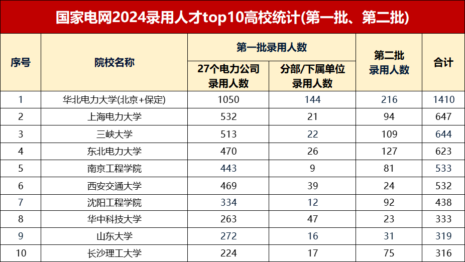 从上表可以看出,上榜的10所高校中,前6所高校录用人数均在500人以上,特别是华北电力大学录取人数更是高达1410人,断层领先!