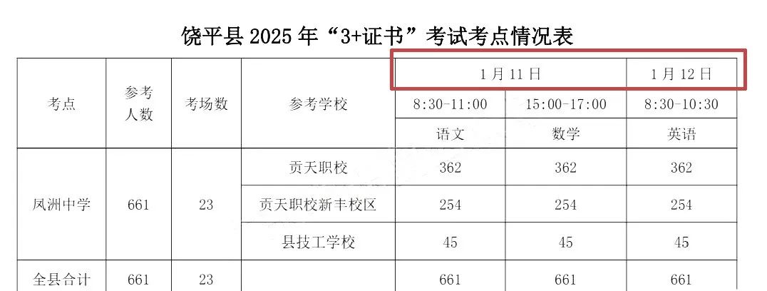 依据广东省潮州市饶平区给出的时间,2025年3+证书考试时间,确定在1月11-12日进行,而第一科语文考试将在早上8:30开始!