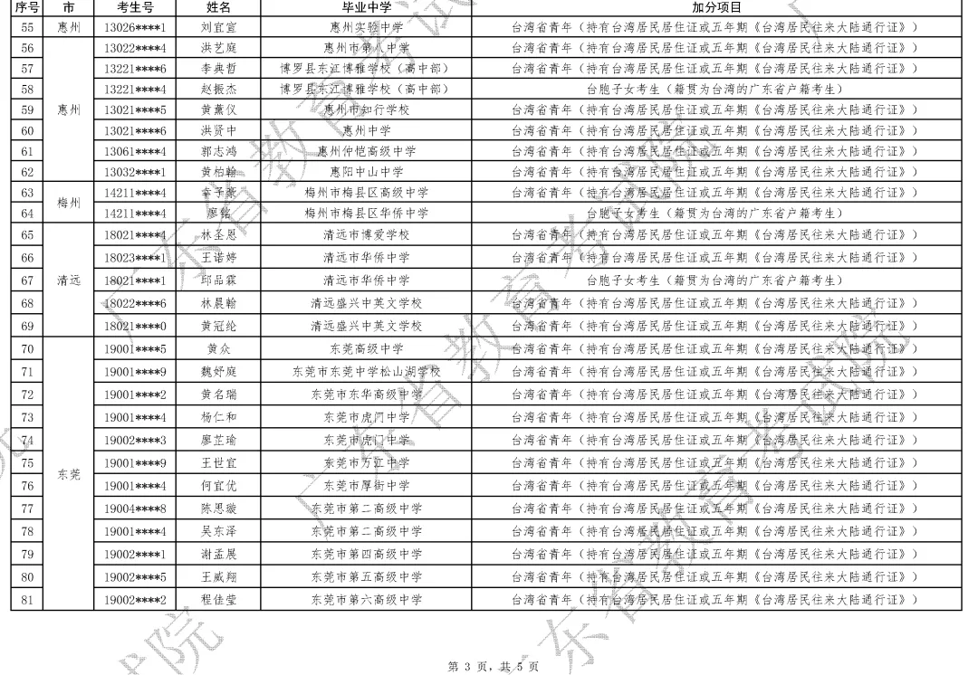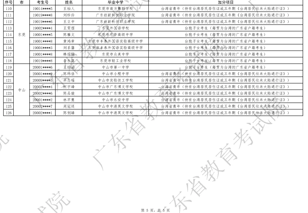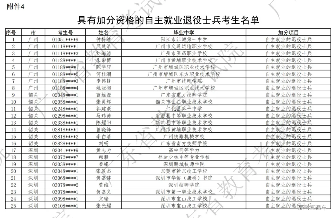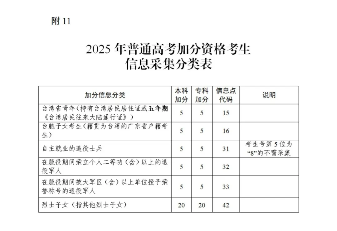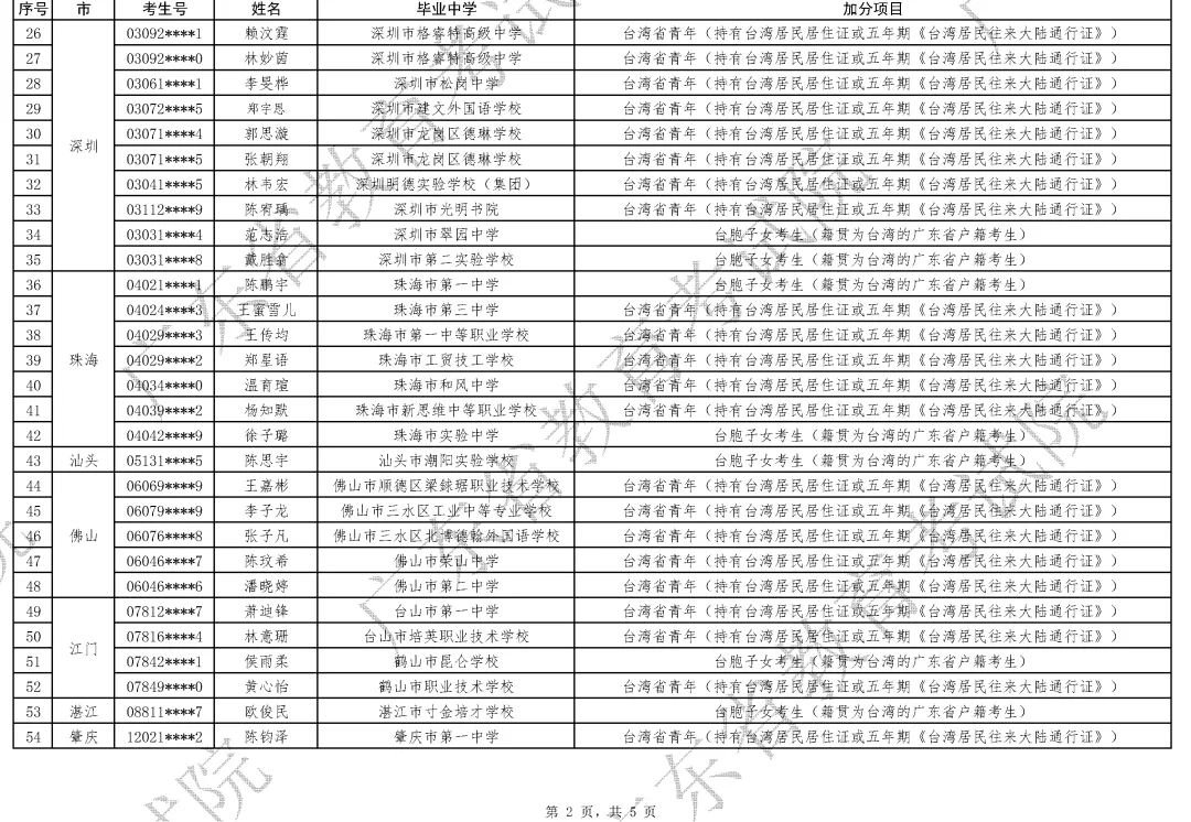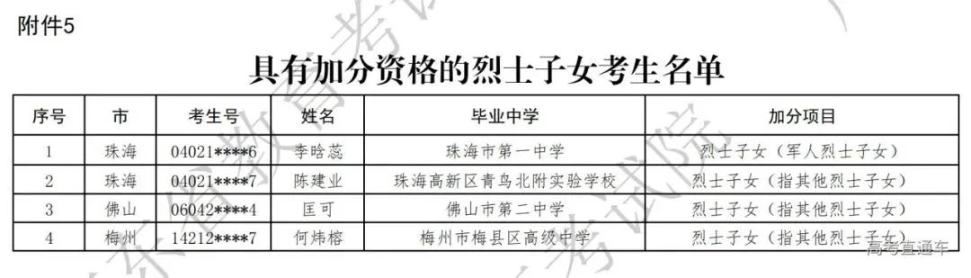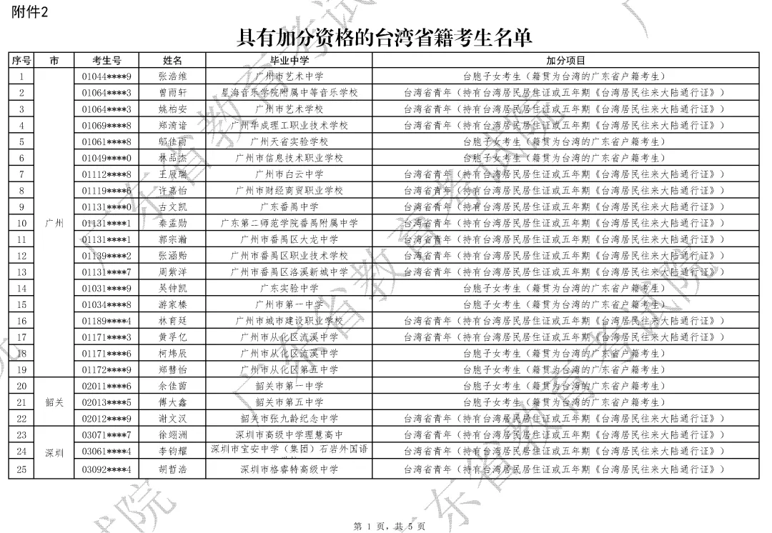 根据《广东省招生委员会关于进一步调整广东省高考加分项目和加强管理工作的通知》(粤招〔2015〕6号)及广东省2025年普通高考报名有关规定,经考生申请、有关部门审核、省招办汇总确认,现将广东省2025年普通高校招生具有加分资格的考生名单(详见附件1-5)发给你们,并就有关事项通知如下: