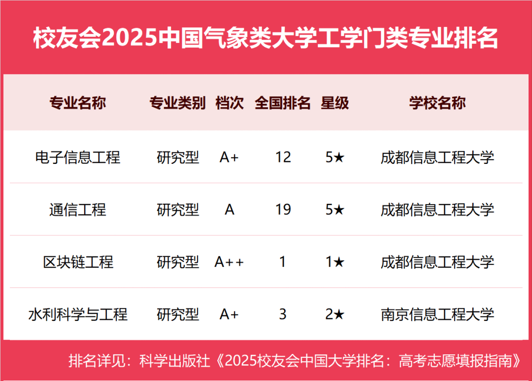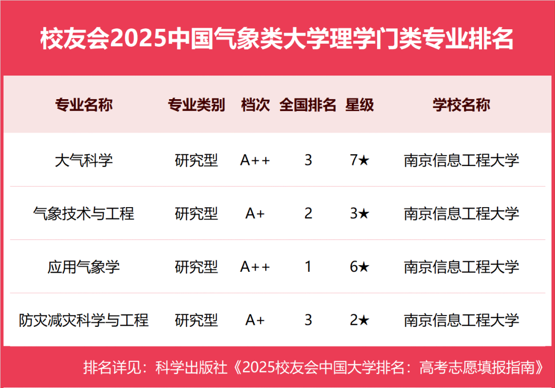 校友会2025中国气象类大学一流专业排名的发布,为考生们提供了一份详尽的报考指南。南京信息工程大学等高校在气象领域的卓越表现,无疑为考生们提供了优质的选择。希望每位考生都能根据自己的兴趣和职业规划,选择到最适合自己的专业和学校,开启美好的大学生活,迈向成功的未来。