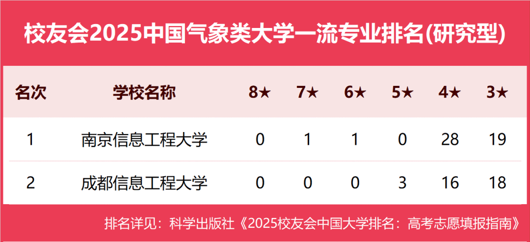 成都信息工程大学则紧随其后,拥有3个中国五星级专业(5★)和16个中国四星级专业(4★),在气象类专业领域同样展现出了不俗的实力。