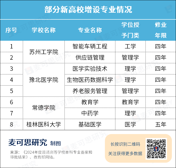 此外,对照教育部网站发布全国普通高等学校名单(截至2024年6月20日),我们注意到共有苏州工学院、豫北医学院、常德学院、桂林医科大学等4所新高校,审批通过增设8个新专业。