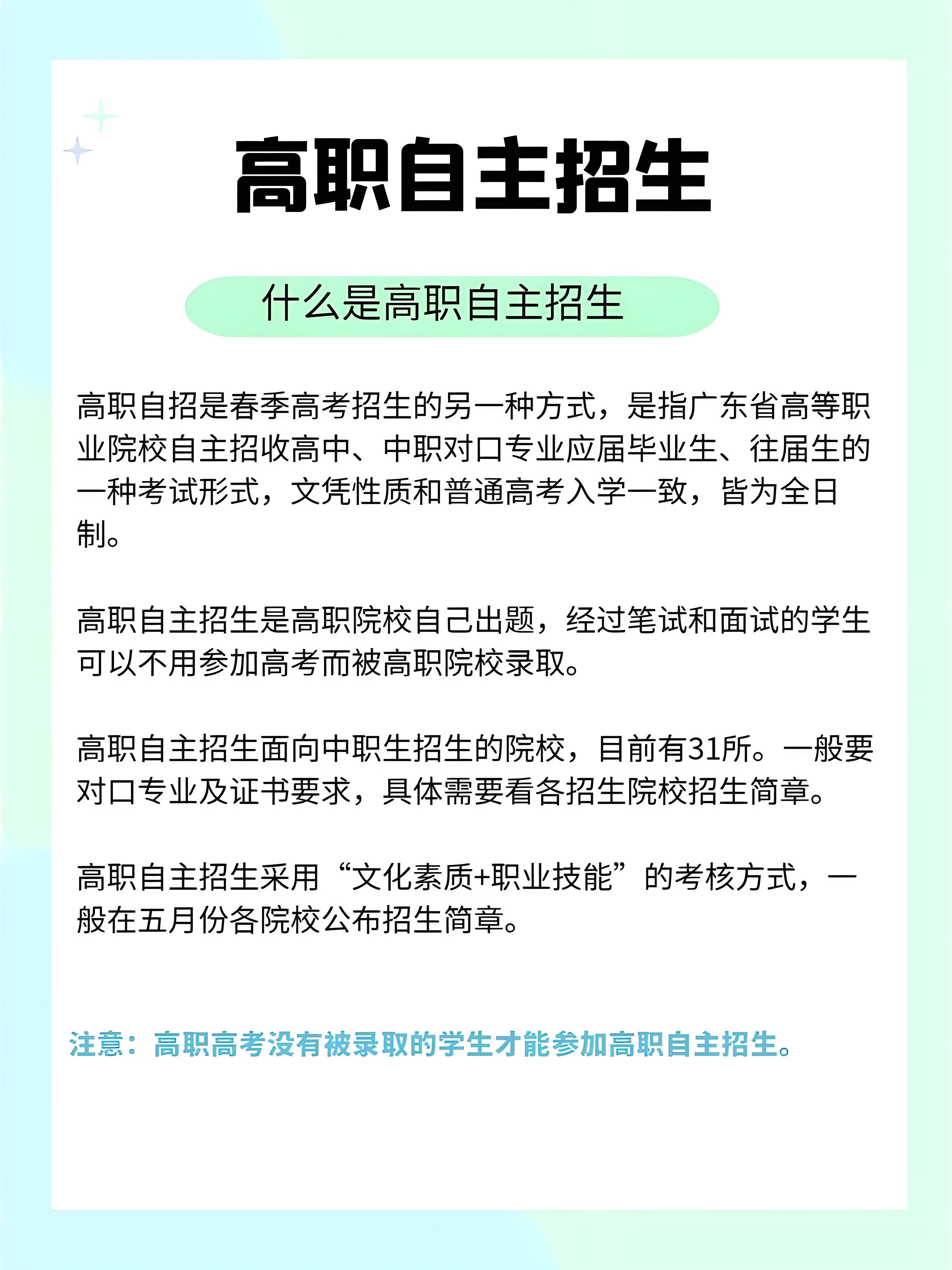 广东省高等职业院校自主招生考试,简称“高职自主招生”“高职自招”“高职单招”,是指经广东省教育厅批准,部分高职院校实施自主确定入学标准、自主进行入学考试(测试)、自主实施招生录取的入学形式。