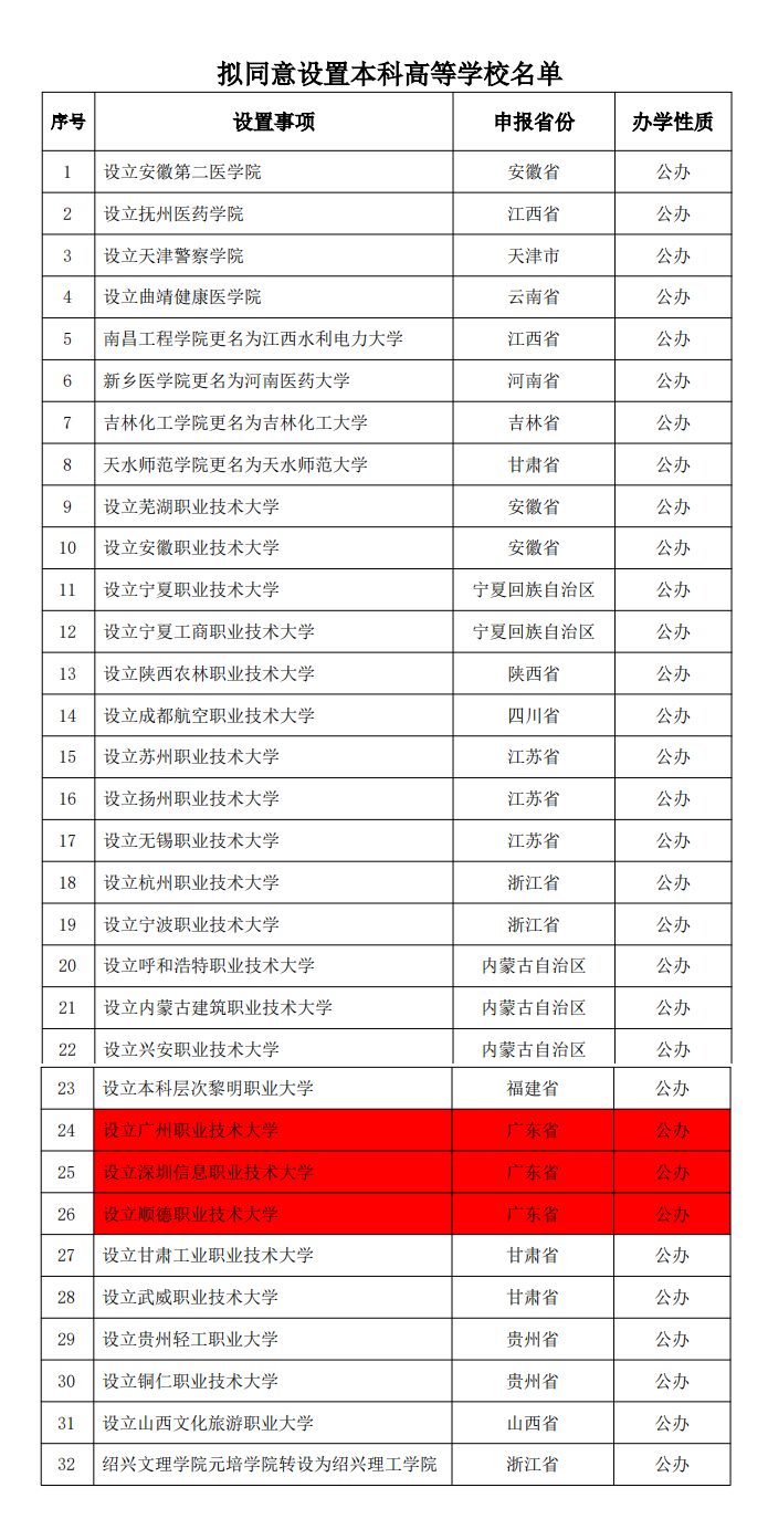 5月22日,教育部发布关于拟同意设置本科高等学校的公示。根据《中华人民共和国高等教育法》《普通高等学校设置暂行条例》《普通本科学校设置暂行规定》《本科层次职业学校设置标准(试行)》等有关规定以及第八届全国高等学校设置评议委员会考察评议结果,经教育部党组会议审议,拟同意设置安徽第二医学院等32所学校。