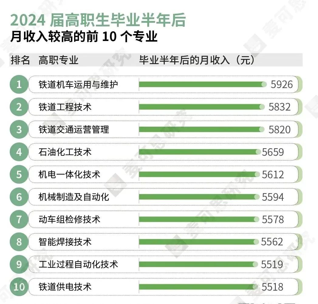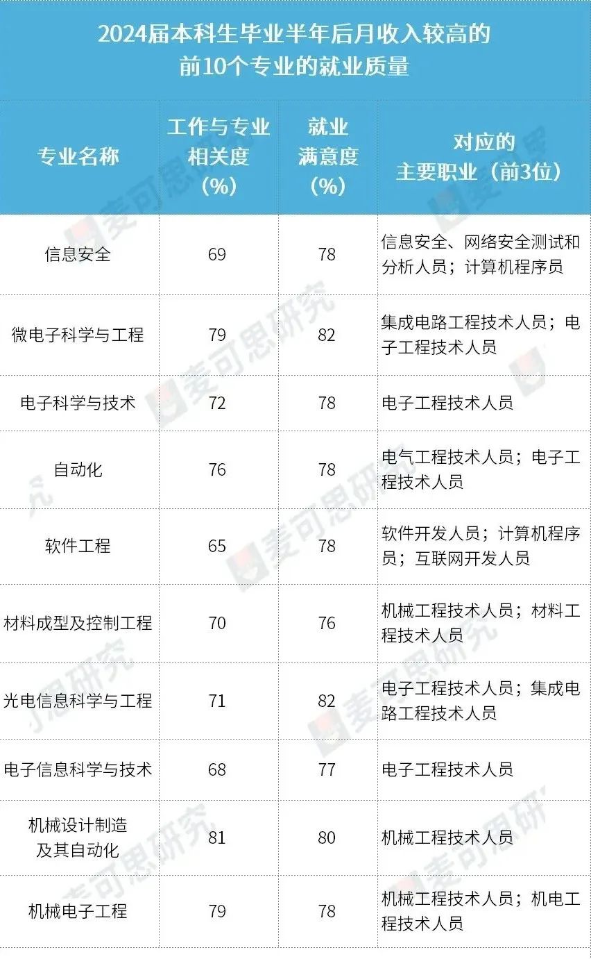 2025年的本科绿牌专业均为本科生毕业半年后平均月收入排前40位的专业。其中,2024届微电子科学与工程专业的平均月收入高达7282元,位列本科高薪专业的第2位;2024届机械电子工程专业的平均月收入为7018元,位列本科高薪专业的第10位。2025年的高职绿牌专业均为高职生毕业半年后平均月收入排前30位的专业。其中,2024届铁道机车运用与维护专业的平均月收入为5926元,就业满意度为85%,工作与专业相关度为84%。根据就业蓝皮书数据,2025年月收入较高的10个本科专业分别为:信息安全(7599元)、微电子科学与工程(7282元)、电子科学与技术(7215元)、自动化(7108元)、软件工程(7092元)、材料成型及控制工程(7077元)、光电信息科学与工程(7076元)、电子信息科学与技术(7058元)、机械设计制造及其自动化(7051元)、机械电子工程(7018元),其月收入均远超本科平均水平(6199元)。本科高薪前十专业全部为工学。