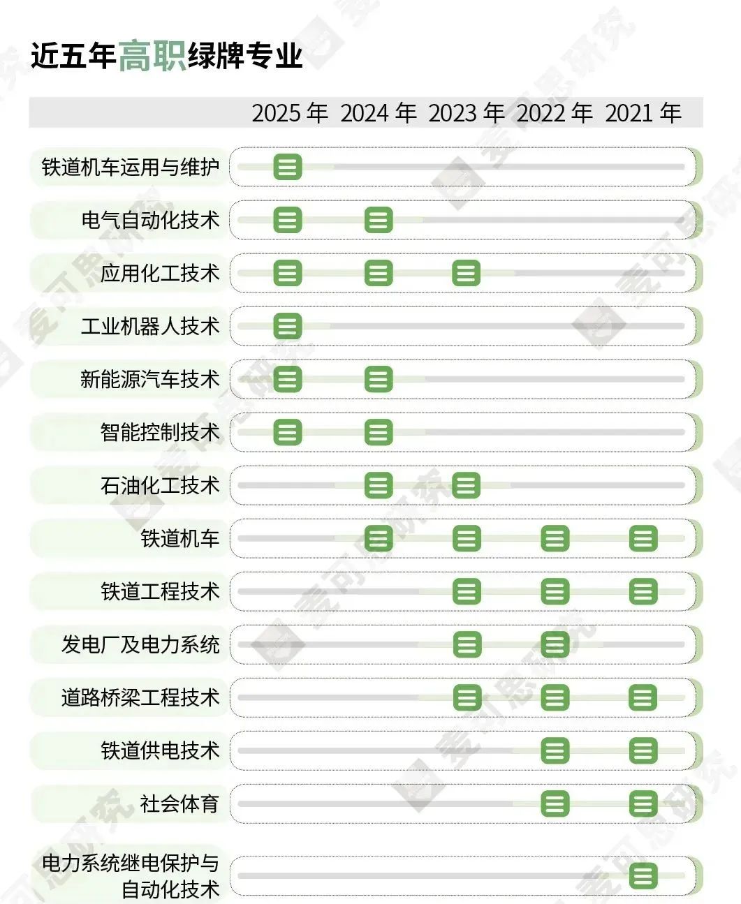 2025年高职绿牌专业包括:铁道机车运用与维护、电气自动化技术、应用化工技术、工业机器人技术、新能源汽车技术、智能控制技术,多为装备制造大类专业。从近五年高职绿牌专业榜单来看,铁道机车上榜4次;应用化工技术、道路桥梁工程技术、铁道工程技术均上榜3次;工业机器人技术、铁道机车运用与维护均为首次上榜。