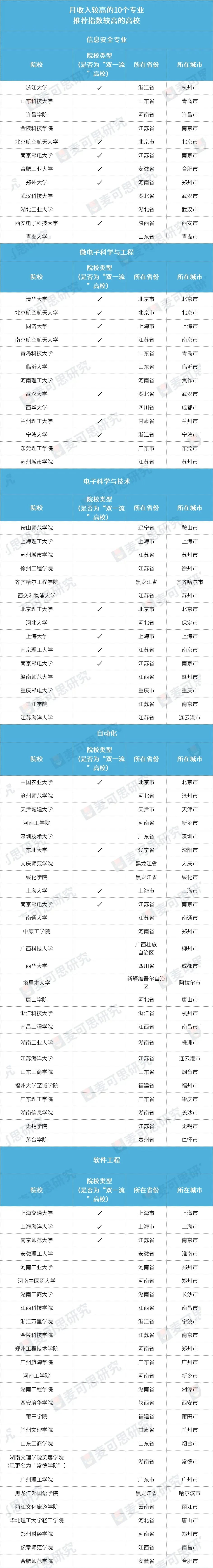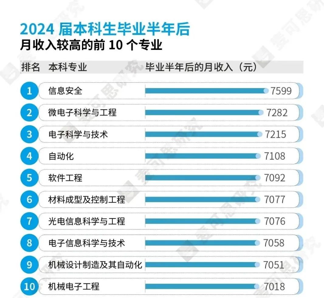 信息安全、微电子科学与工程等专业要求强数理逻辑与工程实践能力。例如,信息安全专业 2024 届月收入 7599 元,位列第一,毕业生主要从事网络安全测试与分析,工作与专业相关度 69%,需持续学习应对技术迭代。电子科学与技术、自动化等专业受益于高端制造与信息技术产业的迭代升级。2024 届自动化专业月收入 7108 元,毕业生多从事电气工程技术人员岗位,就业量较大的智能制造领域薪资竞争力显著。如光电信息科学与工程融合光学、电子学与计算机技术,2024 届月收入 7076 元,毕业生可同时涉足集成电路与光通信领域,就业面宽。需要提醒考生的是,工学类专业普遍对数学、物理要求较高。以软件工程为例,2024 届月收入 7092 元,但需具备较强的逻辑思维,编程能力是关键。因此,在进行专业选择时,要避免盲目追逐薪资,兴趣和擅长领域是更重要的因素,可通过职业兴趣测试工具或基于对自己兴趣、能力的了解,判断是否适合该学科的学习。此外,要通过对行业趋势的研判,把握政策与产业发展脉搏。从宏观趋势观察,与国家战略布局高度契合,深度融入新能源、智能制造等新兴产业赛道的专业,普遍展现出更强的就业竞争力与可持续发展势能,考生在了解自身兴趣能力的前提下,可以重点考虑。如:芯片与信息技术:微电子科学与工程、信息安全等专业连续多年上榜绿牌与高薪榜,国家 “十四五” 规划中集成电路产业规模年复合增长率超 20%,人才缺口超 20 万人。新能源与碳中和:新能源科学与工程、自动化(能源方向)等专业受益于光伏、储能产业爆发,2024 届工学毕业生月收入 6841 元,连续三年领跑各学科。智能制造与机器人:机械电子工程、机器人工程等专业契合 “中国制造 2025”,工业机器人安装调试岗位需求年增 30%,2024 届机器人工程专业毕业生平均起薪超 7000 元。此外,需要特别提醒的是,要警惕产业迭代风险的预警。传统计算机类专业(如软件工程)近三年退出绿牌榜,需关注细分领域专业的迭代升级。例如,软件工程与人工智能结合的 “智能软件” 方向,薪资涨幅比传统开发高 15%。从院校选择的维度来看,则需注意院校的专业实力与地域资源的匹配与协同。“双一流” 与特色院校并举:双一流高校在科研资源上占优,如清华大学微电子科学与工程,依托国家集成电路产教融合创新平台,毕业生深造率超 60%。地方特色院校侧重应用培养,如南京邮电大学信息安全专业,与华为、中兴共建实验室,毕业生在长三角 IT 企业就业率达 78%。