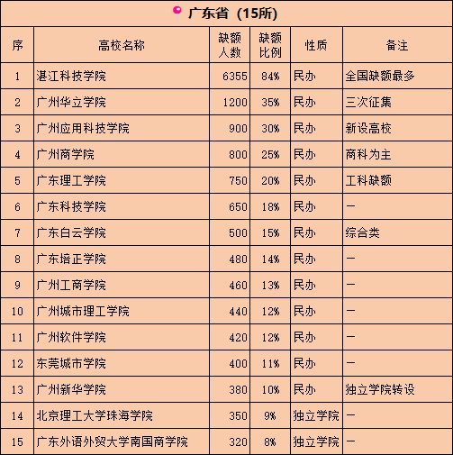 2025 年广东省本科招生录取工作进入尾声,一份包含 15 所高校的未完成计划名单引发关注。这份名单清晰呈现了民办高校及独立学院在招生环节面临的实际挑战:15 所院校均为民营办学性质,总缺额人数可观,其中湛江科技学院以 6355 人的缺额数和 84% 的缺额比例位居榜首,成为全国同类院校中缺额最多的高校。