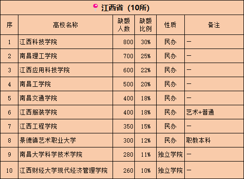 从细节来看,各校特色鲜明:江西服装学院结合 “艺术 + 普通” 办学定位,缺额 400 人,占比 18%;景德镇艺术职业大学作为职教本科院校,缺额 300 人,占比 12%;南昌大学科学技术学院、江西财经大学现代经济管理学院等独立学院也存在 10%-11% 的缺额。这些数据不仅为考生后续征集志愿提供了重要参考,更直观反映了江西民办高等教育在生源竞争中的差异化表现。