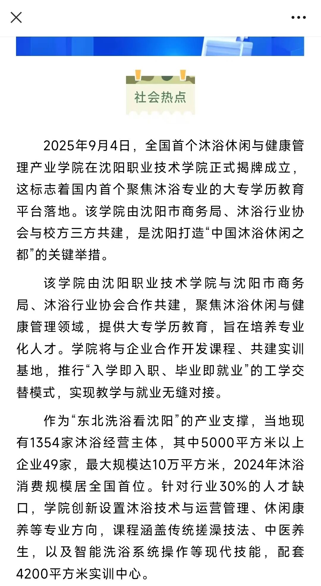 就在前几天,全国首个“沐浴休闲与健康管理产业学院”在沈阳职业技术学院正式揭牌成立!你没听错,洗澡、搓背、足疗、按摩……这些我们以为“街边小店”的手艺,现在要走进高校课堂了!