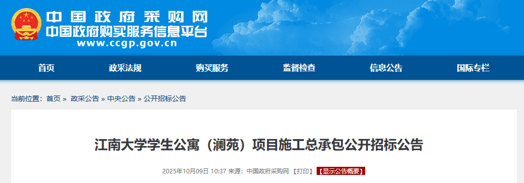 10月9日,中国政府采购网发布《江南大学学生公寓(澜苑)项目施工总承包公开招标公告》。公告显示,经教育部、无锡市数据局批准,江南大学拟新建学生公寓(澜苑),项目施工总承包预算金额为40000万元(人民币)。